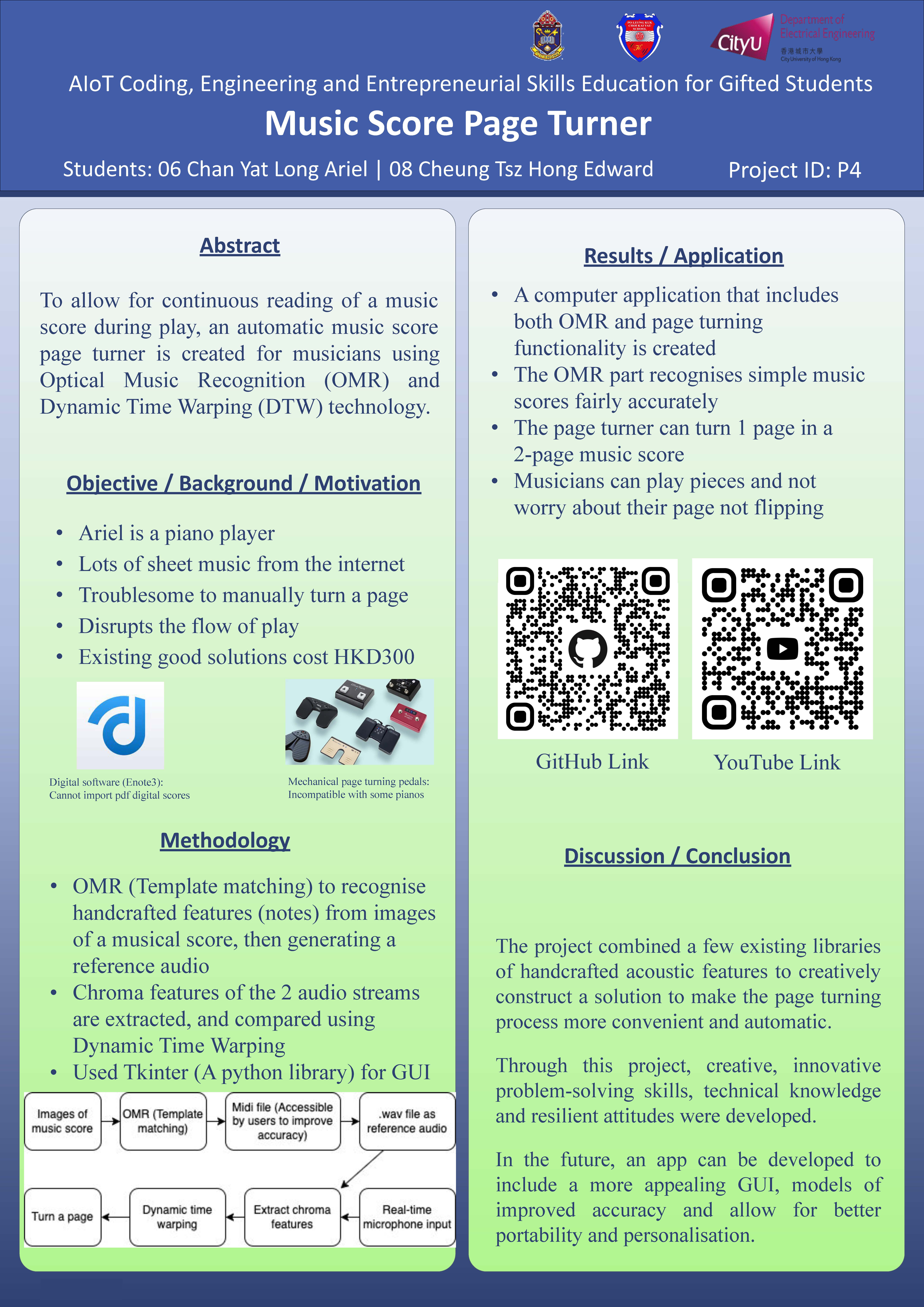To allow for continuous reading of a music score during play, an automatic music score page turner is created for musicians using Optical Music Recognition (OMR) and Dynamic Time Warping (DTW) technology